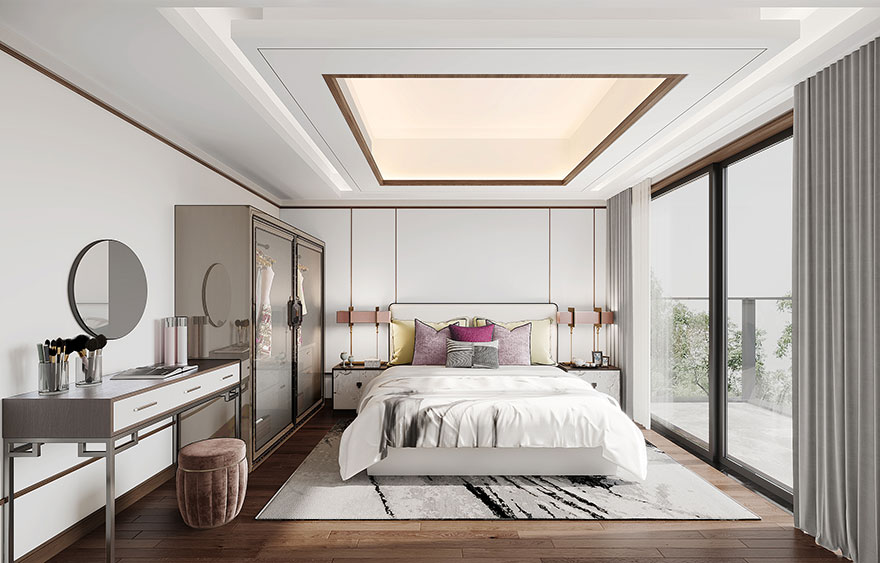 新中式别墅装修设计,一起已经示范了一套,但是销售不理想,追加这套样板房。以白色为主,胡桃木线条做跳色。样板房装修标准,控制价格4500元/平方米,实际价格3850元一平方。