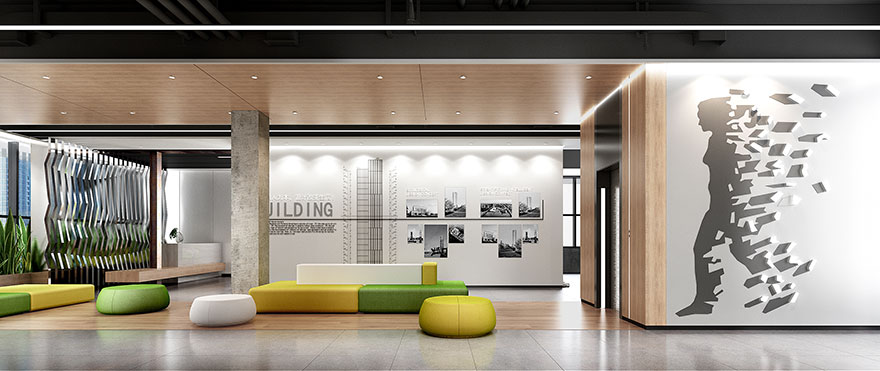 The layering technique of different materials shows the company's characteristic image background wall, reflecting the unconventional form. A large area of glass entrance doors allow the visual beauty of the entire corridor to be unobstructed by redundant structures, like the cover of an architectural magazine. When you enter the corridor, you will open the title page of the magazine. On the left is the introduction of the company. On the right is the outdoor scenery.